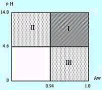 在日本,根據(jù)厚生省告示第 17 號“容器包裝、充填加壓加熱殺菌食品”的標(biāo)準(zhǔn)中被定義為 如圖 1 所示 pH 值超過 4.6 、且水分活性超過 0.94 的范圍,在充填該類食品進行加熱加壓時,必須對中心部采取以 120 ℃ 、加熱 4 分鐘的方法或與其具有同等效力以上的方法進行殺菌。