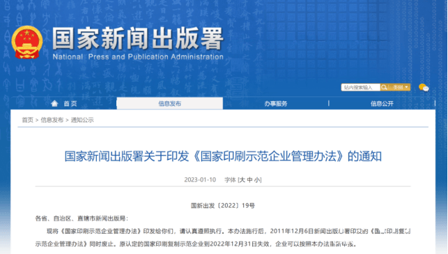2023年1月10日,國(guó)家新聞出版署官網(wǎng)發(fā)布《國(guó)家印刷示范企業(yè)管理辦法》,2011年12月6日新聞出版總署印發(fā)的《國(guó)家印刷復(fù)制示范企業(yè)管理辦法》同時(shí)廢止。原認(rèn)定的國(guó)家印刷復(fù)制示范企業(yè)到2022年12月31日失效,企業(yè)可以按照本辦法重新申報(bào)。《辦法》提出,國(guó)家印刷示范企業(yè)分為四類:保障支撐類、創(chuàng)新引領(lǐng)類、智能制造類、專業(yè)特色類。國(guó)家新聞出版署每?jī)赡杲M織開展一次國(guó)家印刷示范企業(yè)的評(píng)審認(rèn)定。
