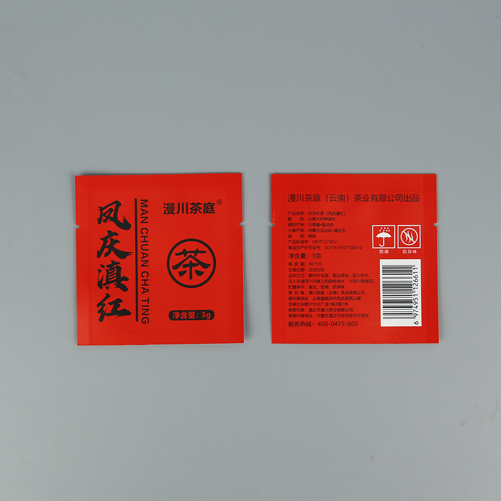 三層復(fù)合,表面PET、OPP為印刷層,中間層為PET鍍鋁,內(nèi)層直接接觸茶葉的是PE或CPP。選擇表層為PET這種組合的優(yōu)勢是,PET是沒有延伸性及耐高溫材料,在印刷時能保證不會因?yàn)樯炜s而導(dǎo)致圖案位移;因?yàn)槟透邷?,在熱封制袋的時候也不會因?yàn)楦邷囟冃?;中間層的鍍鋁可以增加材質(zhì)質(zhì)感及有一定程度的遮蔽光線效果;內(nèi)層PE是食品級可直接接觸食品的材料,并且具有很好的熱封性。